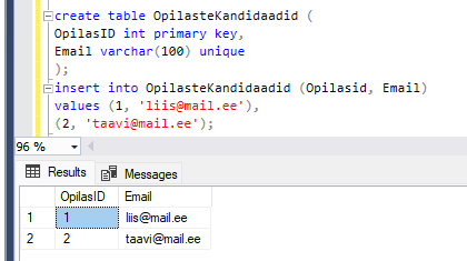 Unique key – piirang tagab, et kõik veeru väärtused on erinevad.