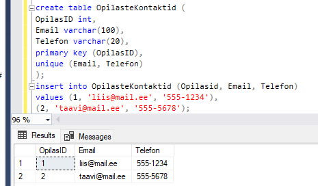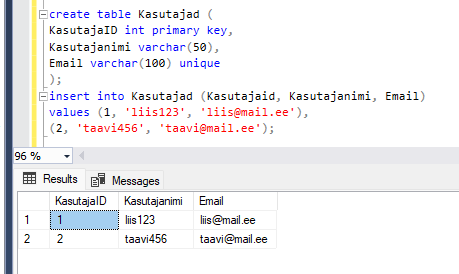- Kui me ei kehtesta võtme või tabeli suhtes rohkem piiranguid, siis on eespool toodud näites kasutajanime atribuut lihtne võti.