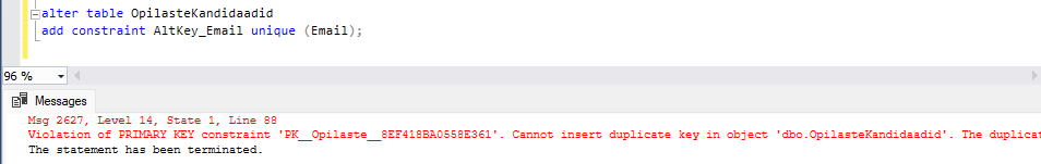 - Primary key – piirangut kasutatakse tabeli iga kirje unikaalseks identifitseerimiseks.