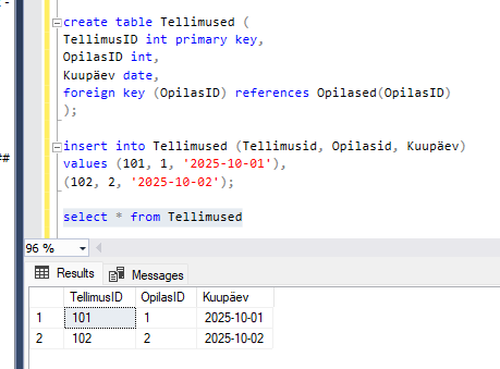 - FOREIGN KEY on üks tabelis olev väli (või väljade kogum), mis viitab teise tabeli PRIMARY KEY-le. (tabelite seostamine)
