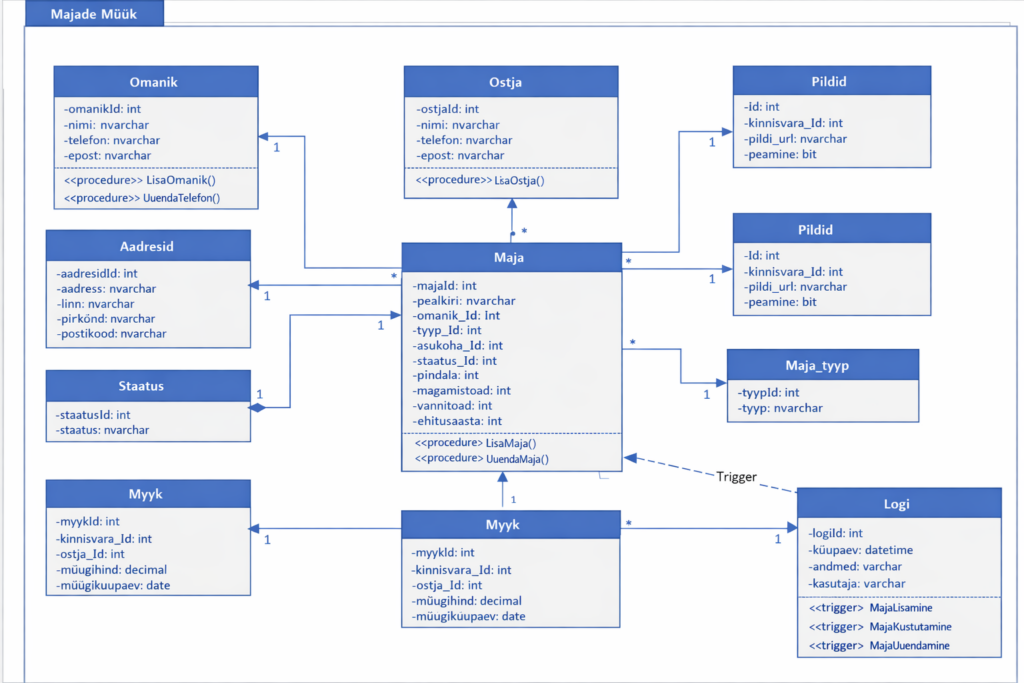 Diagramm kujutab Majade müük andmebaasi struktuuri ja seoseid erinevate tabelite vahel, mis haldavad kinnisvara müügi protsessi.