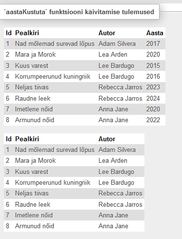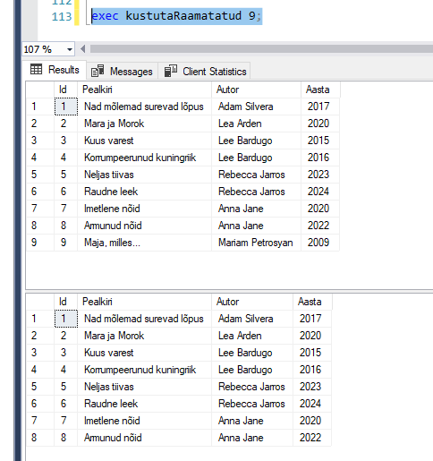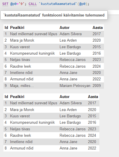 – Protseduur, mis kustutab raamatu pealkirja, autori ja aasta.