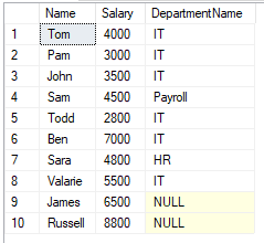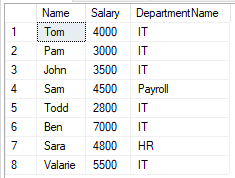 --kirjutamine lihtsamaks Select e.Name, e.Salary, d.DepartmentName from Employees e join Department d on e.DepartmentId=d.Id