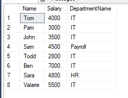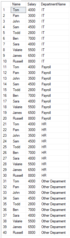--cross join --näitab nii, et 1.tabelis väärtused * 2.tabeli väärtused select Name, Salary, DepartmentName from Employees cross join Department