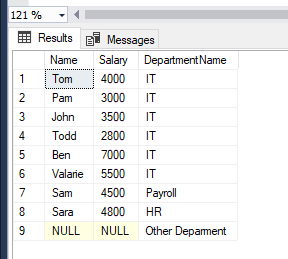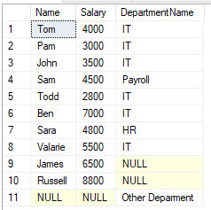 --right Join Select e.Name, e.Salary, d.DepartmentName from Employees e right join Department d on e.DepartmentId=d.Id
