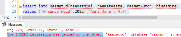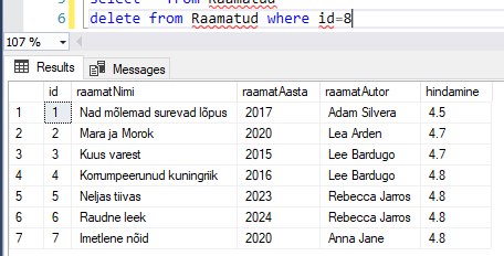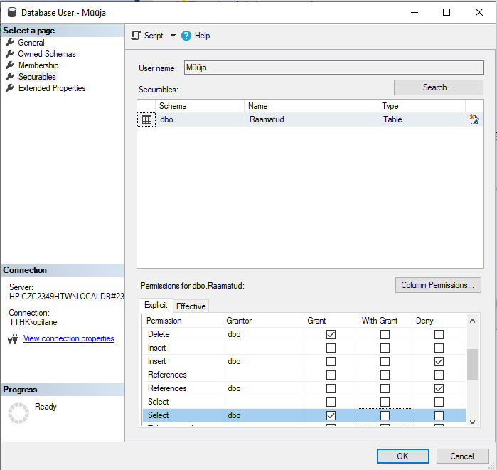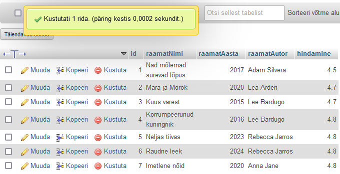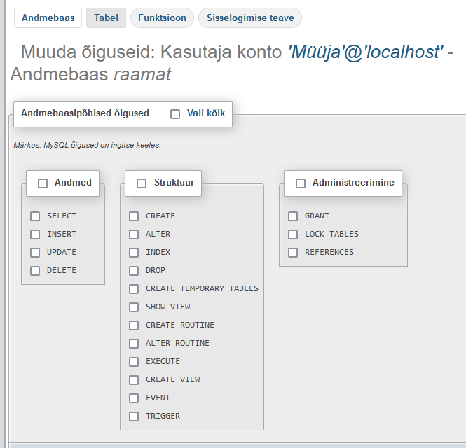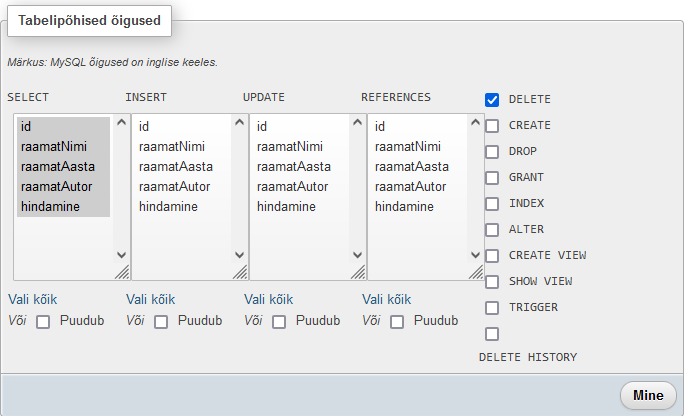 Olen lubanud tabeli andmete vaatamise ja kustutamise.