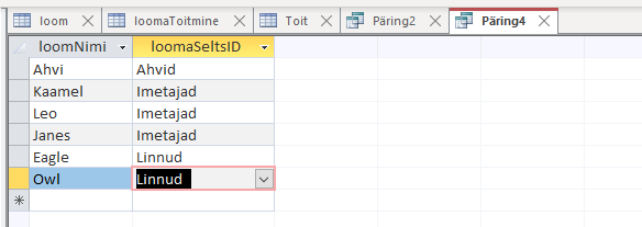 SELECT loomNimi, loomaSeltsID FROM loom WHERE loomNimi Like 'k*' or paritoluMaa Like 'L*'