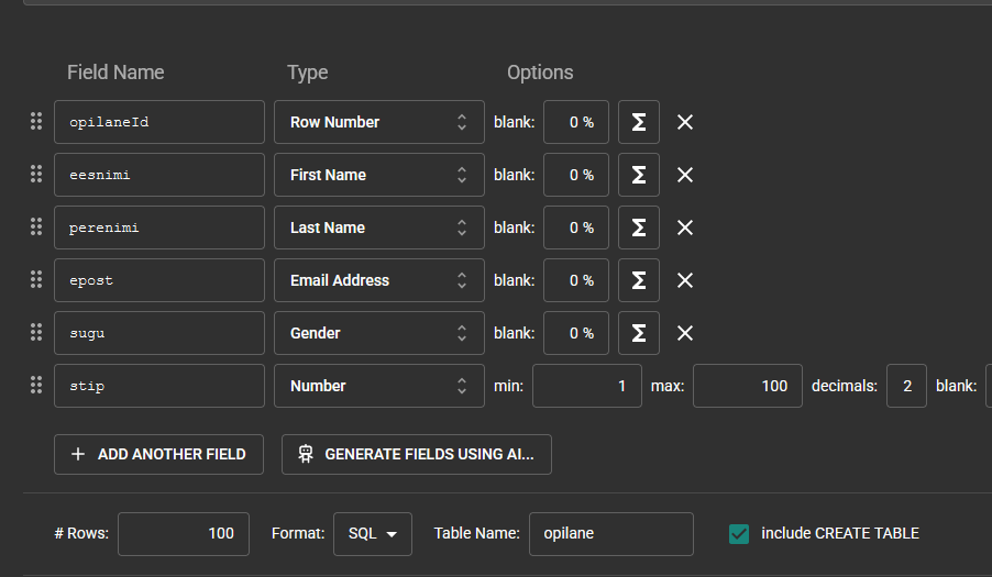 Genireerimine andmed mockaroo abil
