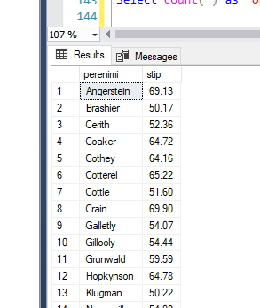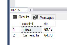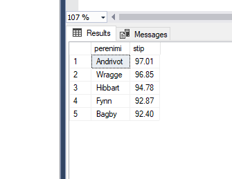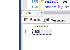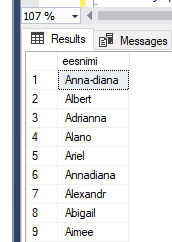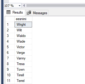 --näita eesnimed, kellel esimene ja viimane täht on sama select eesnimi from opilane where left(eesnimi, 1)=right(eesnimi, 1); -- < - väiksem kui, > - suurem kui, = - võrdne --näita õpilased, kelle sip on suurem kui 50 ja väiksem kui 70 select perenimi, stip from opilane where stip>50 and stip<70 --between select perenimi, stip from opilane where stip between 50 and 70 order by perenimi --päringus sorteerimine ORDER BY kirjutame viimasena